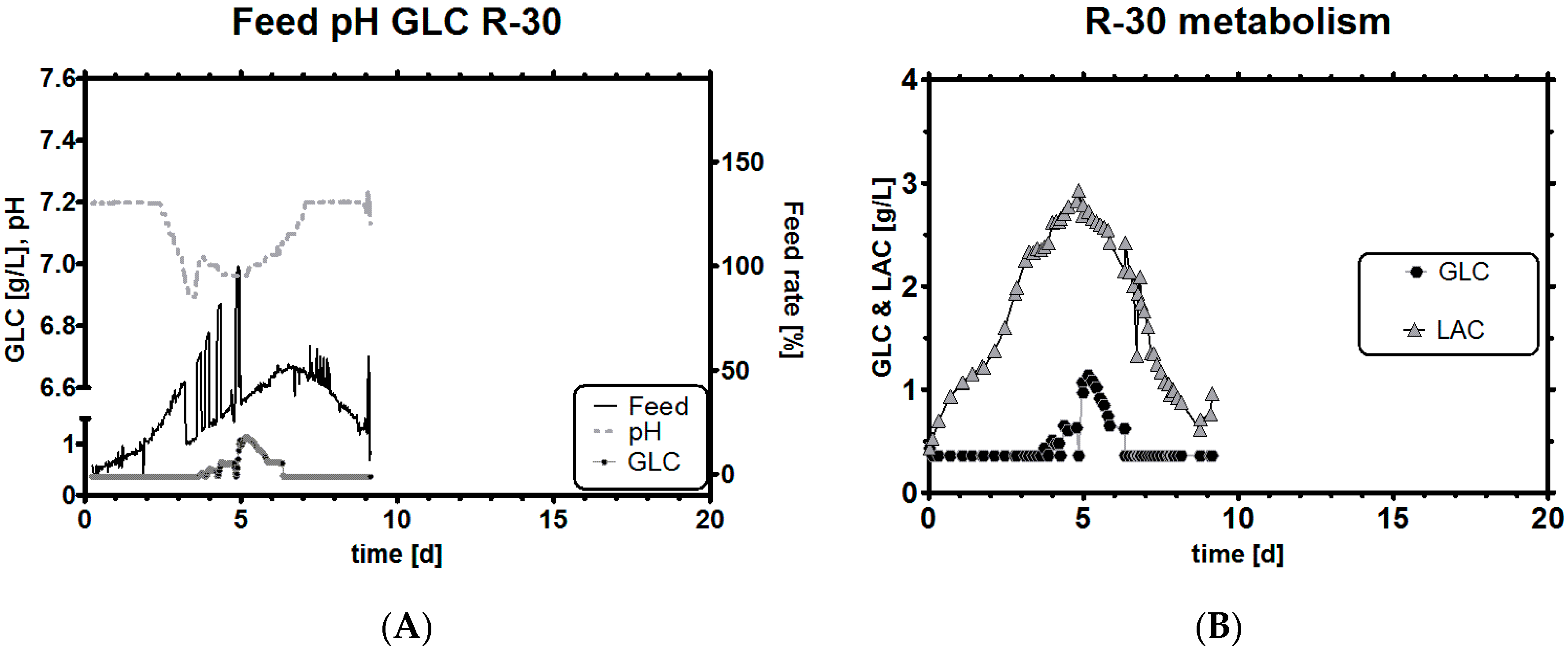Summarizing our findings, we found that qGlc was by far the most important parameter to describe qLac behavior in process development runs, while H+ as well as LAC apparently played a role as well, although much less pronounced. GLC was statistically correlated with qLac due to the nature of the clone to consume lactic acid also during high glucose concentrations, but this particular finding was of little practical use. Therefore, the following experiments featured a modification of the most important parameters, which are qGlc and H+, in a glucose-limited state.