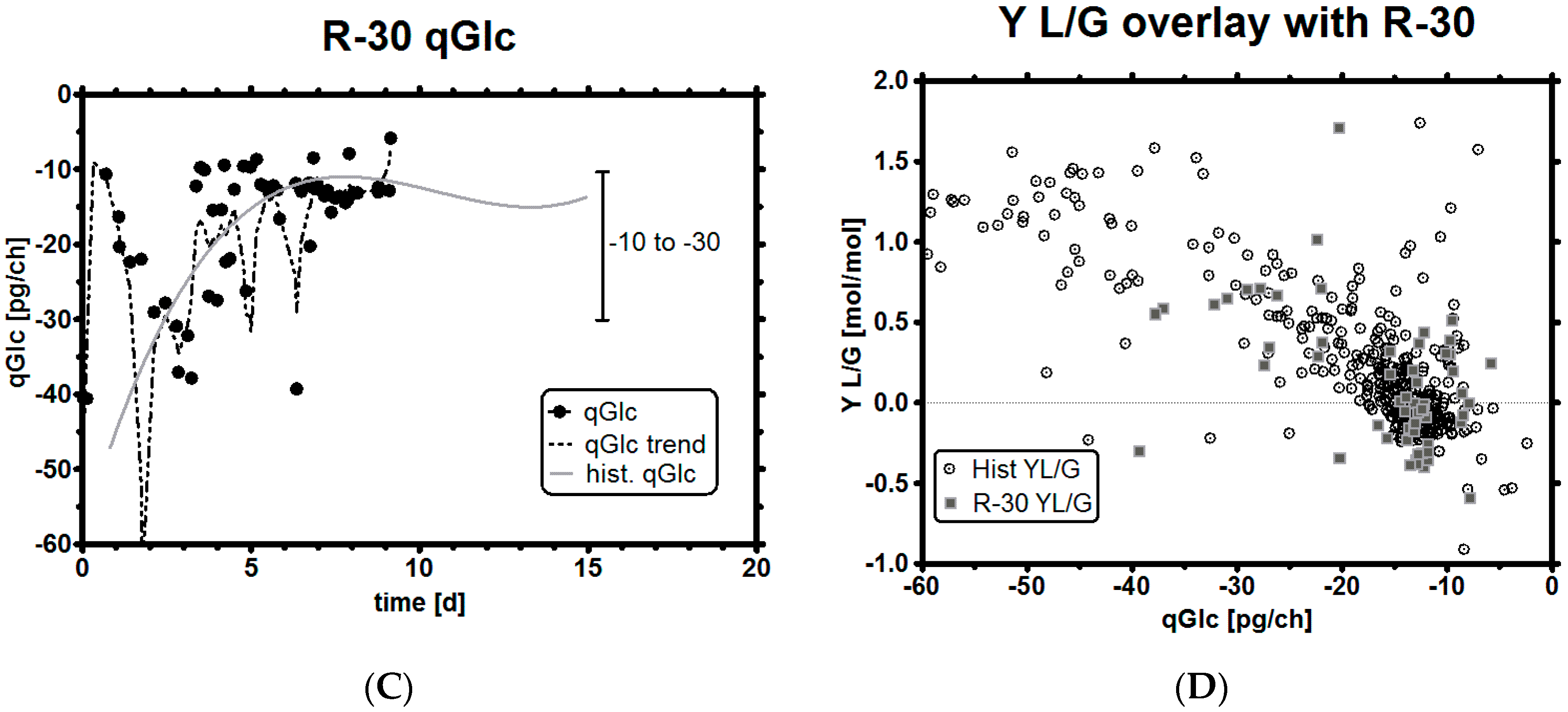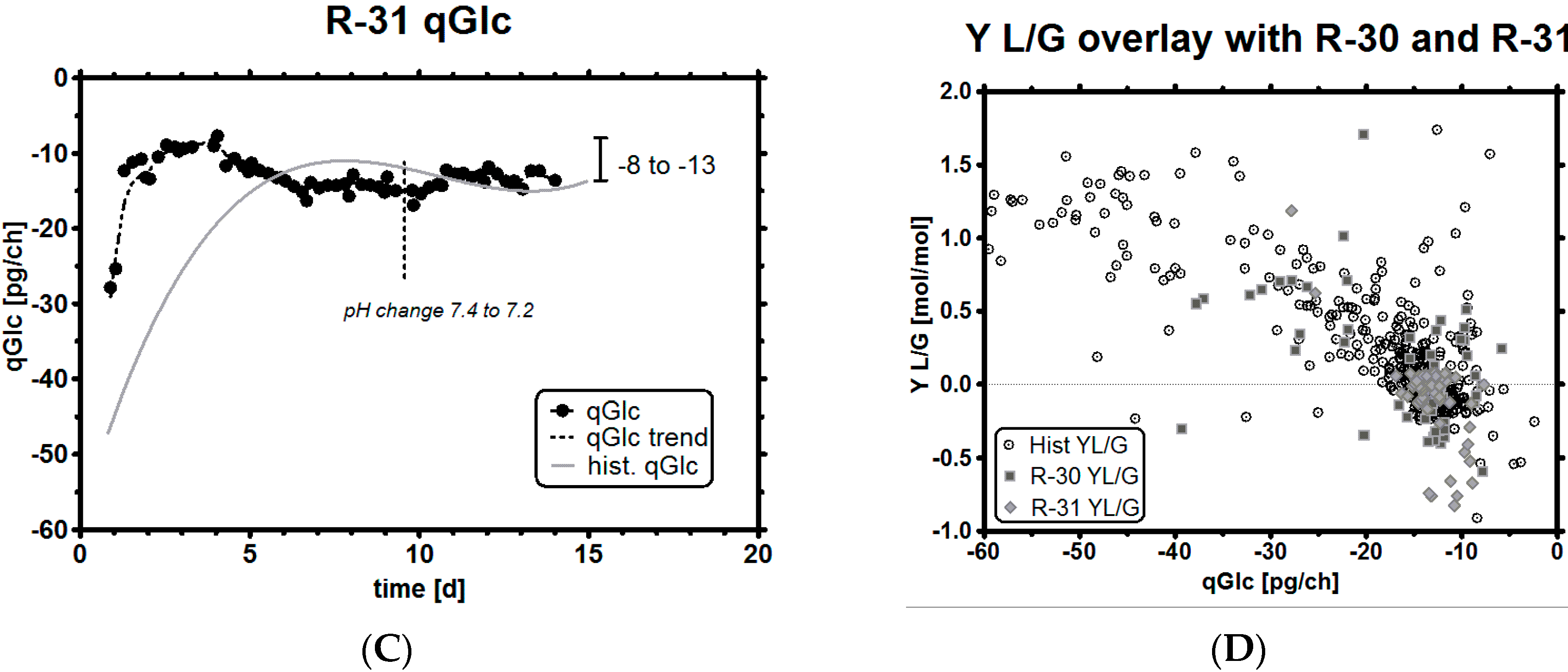 Figure 4A,B show qGlc and on-line pH profiles of all 29 process development runs. The pH of all observations was split into two groups, higher or lower than pH 6.9, and plotted against qGlc. Under high pH conditions, a high qGLC range was observed, while at acidic pH, qGlc was more restricted (Figure 4C,D). As a result, high pH was often associated with high qGlc and vice versa. During the mid- and end-phase, pH did not impact or change qGlc much, while the effect that pH might exert on qGlc was strongest while the cells were growing well. Therefore, pH may be used indirectly to change qLac, as both qGlc and qLac are highly correlated (Figure 2D).