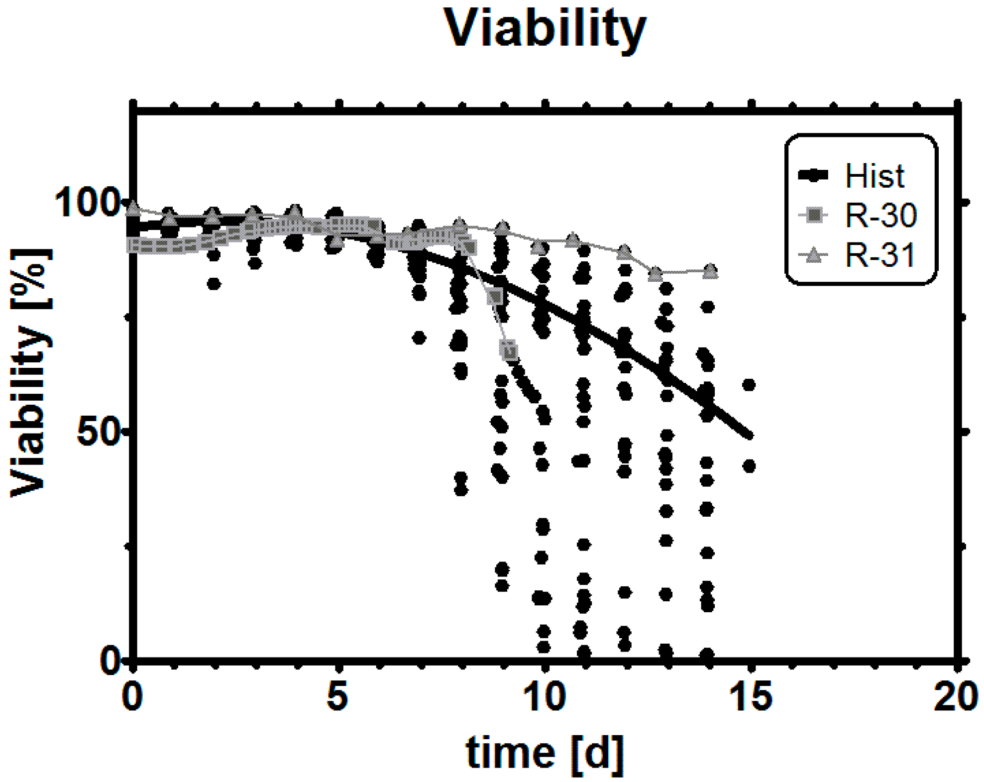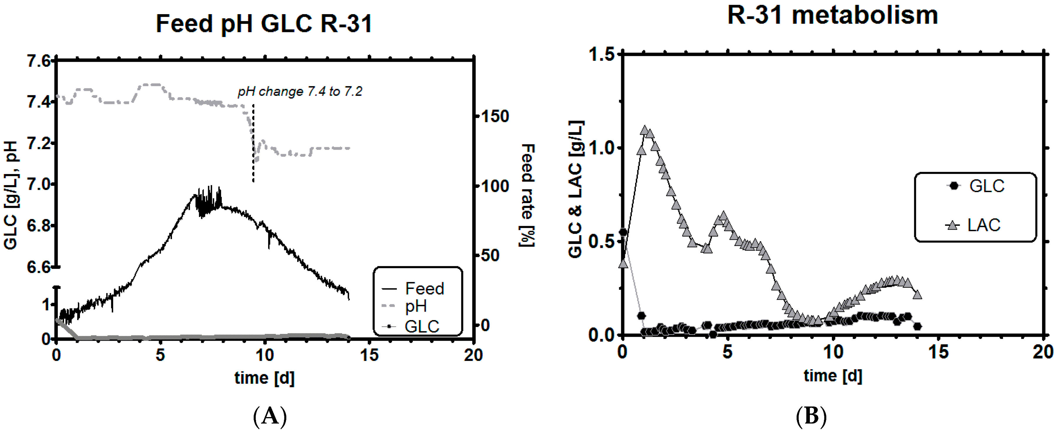 † The pH range was chosen to lie in the physiological range. However, it could be extended to conditions close to the maximum tolerance which may lie somewhere between pH 6.5 and up to 8.0 for mammalian cells [27]; ‡ The correction order of the set-point is as follows: first pH, then online analyzer. This is important because if the feed is already reduced by pH, it was not done so a second time by the online analyzer. The online analyzer in experiment R-31 had no purpose other than monitoring the metabolite concentrations; ∫ A high glucose concentration is the current status quo in most industrial mammalian cell culture processes.
