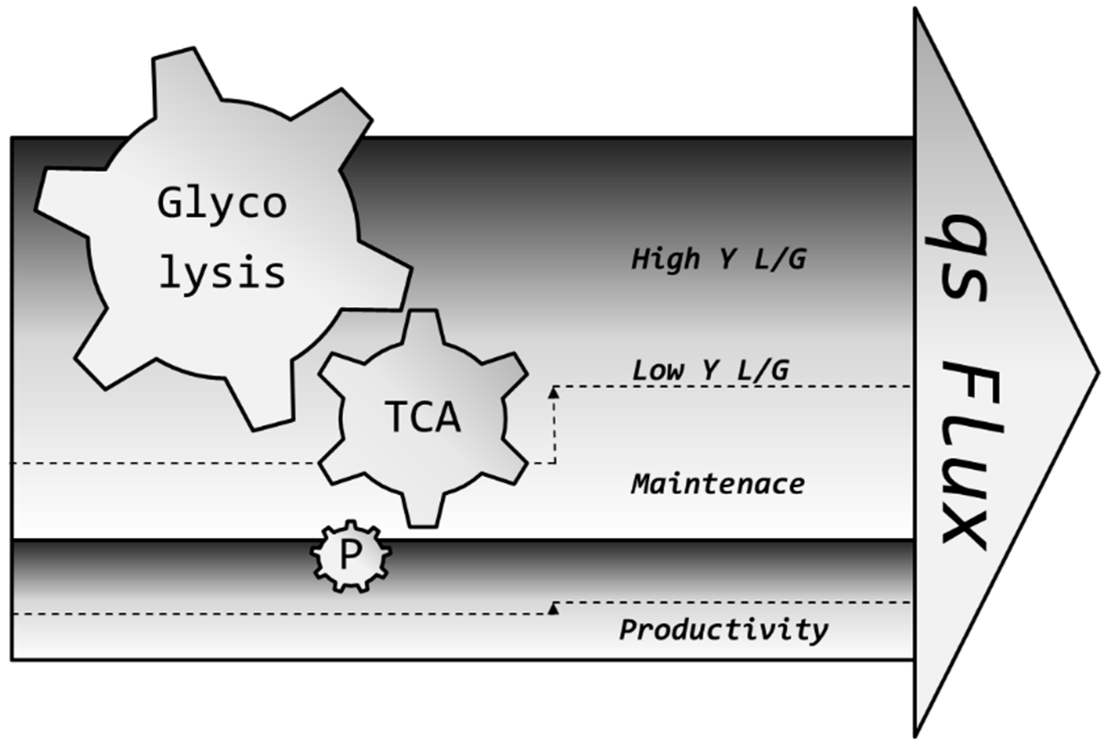The most important parameter which influences qLac and therefore LAC levels in the fermentation is qGlc. Other important parameters which also influence qLac, such as oxygen availability [62] or methods to improve pyruvate uptake into the tricarboxylic acid circle (TCA) [6], are acknowledged but out of scope of this publication. Historical data showed that the cells apparently never consumed less glucose than approximately 8 pg/ch (pg per cell per hour) and the gross of all measured qGlc lied in the range of 10–20 pg/ch. Plotting qGlc versus the yield qLac/qGlc (in short Y L/G) implies that, with the control of qGlc, a particular target yield might be achieved (Figure 5). This relationship may also be used to design a stoichiometric feed by trying to feed at a defined qGlc set-point in further experiments.
