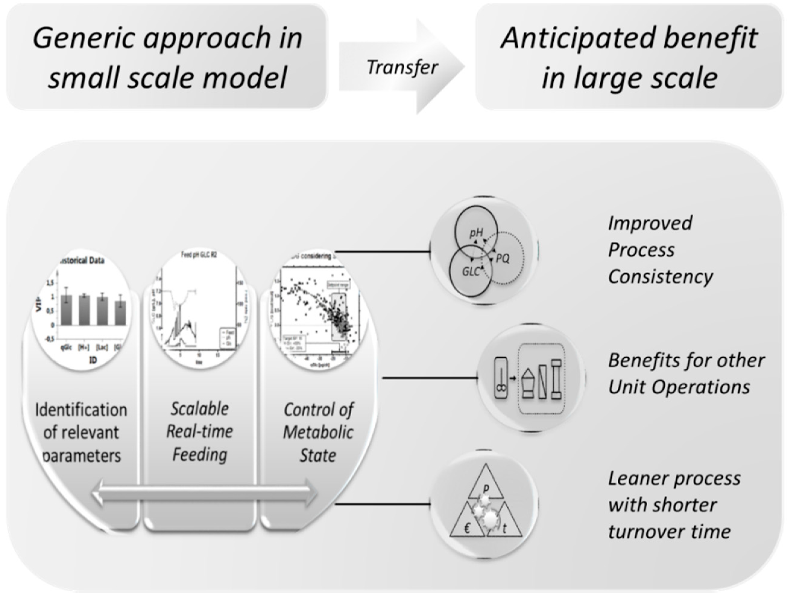We do not claim to offer solutions to all mentioned points but want to make the reader aware of their existence and propose solutions for some of them in our own work: the herewith presented adaptive feeding strategy was based on estimation of biomass in the current process, making it independent of historical data. The method we used in our labs to estimate biomass, and with it the adaptive feeding rate, has been shown in a previous contribution to be transferrable between clones and scales [52].