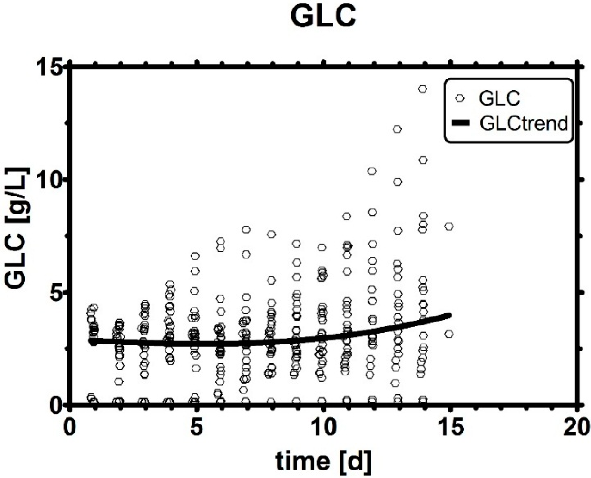 From the available variables and the considerations above, the following were always available in all processes, for the whole process time, and therefore the most straightforward to describe lactic acid production or consumption (qLac): (i) glucose concentration (GLC); (ii) specific glucose consumption (qGlc); (iii) pH in the form of hydrogen ion concentration (H+); and (iv) lactic acid concentration (LAC).