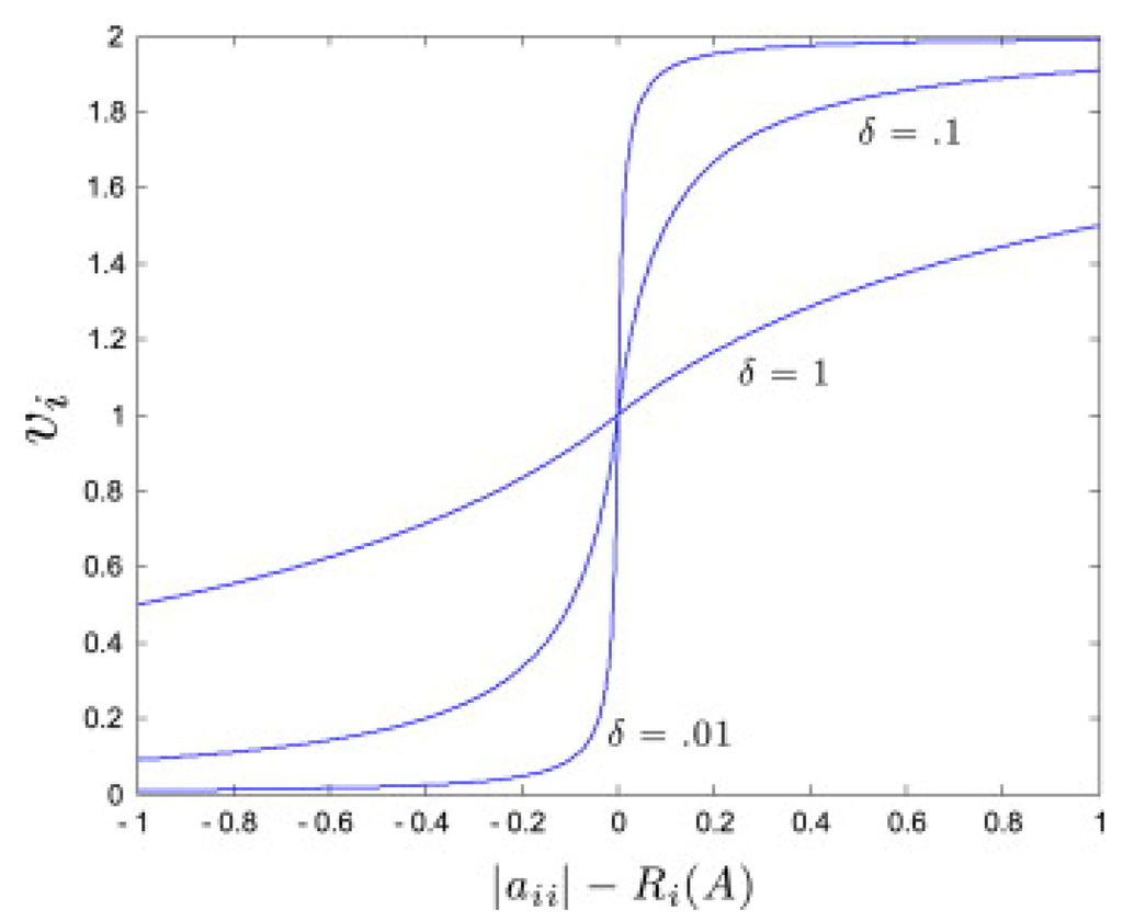 Since and A have the same eigenvalues for all invertible matrix V, it is possible to apply Geršgorin’s theorem to . For a good choice of V, one can find some tighter bounds for the eigenvalues. [26]. A particularly convenient choice is , with for all . Then, . It follows therefore that, , the real part of an eigenvalue of A must satisfy [26]: