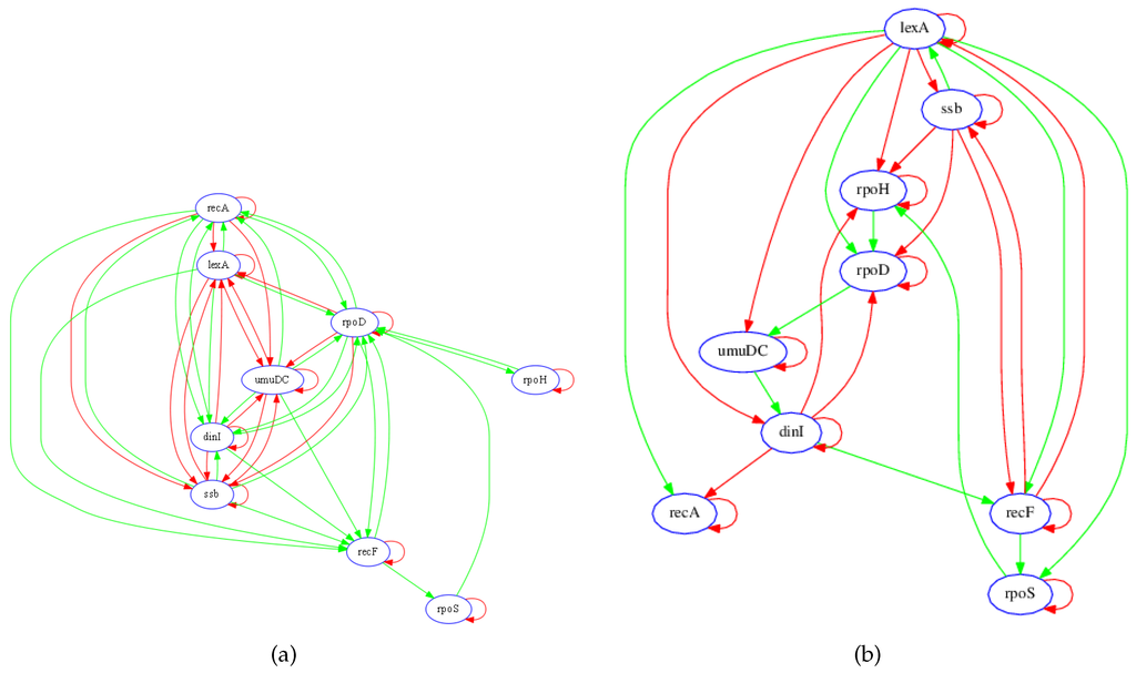The sub-network considered, shown in Figure 2a, consists of nine genes and several transcription factors and metabolites [8] whose expression levels are measured over nine different perturbations. According to Gardner et al. [8], the nine transcripts in the test network (Figure 2a) were chosen to enable evaluation of the performance of their proposed algorithm. These nine transcripts include the key mediators of the SOS response (lexA and recA) and sets of genes with known regulatory roles (ssb, recF, dinI, and umuDC) and unknown regulatory roles (rpoD, rpoH, and rpoS). The presence of genes with regulatory roles that are already known allows this network to be used to validate an inference algorithm [8].