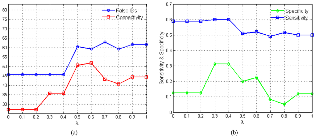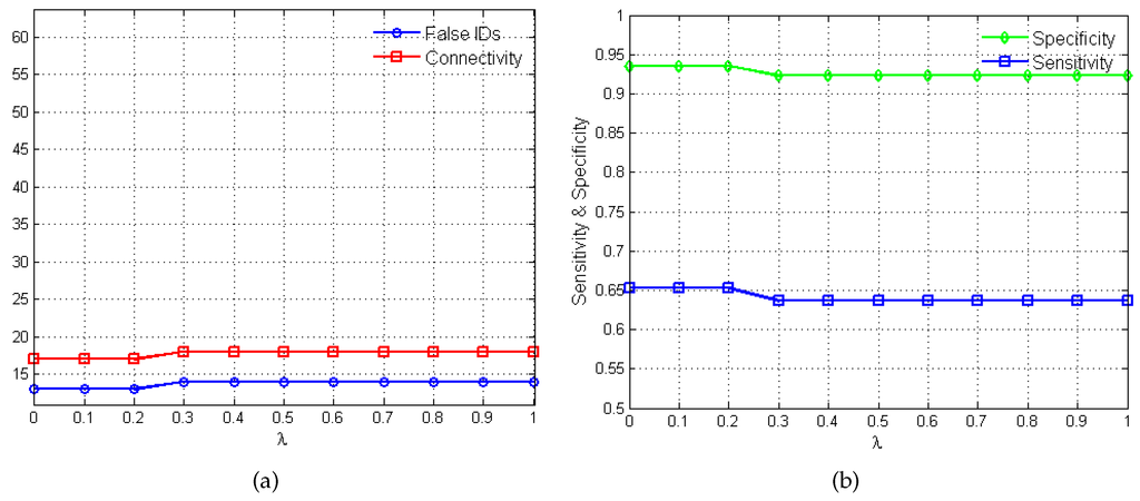 Variations in λ and the corresponding algorithm performance. (a) plot of λ versus total number of false identifications and net connectivity in percentages; (b) plot of λ versus sensitivity and specificity.