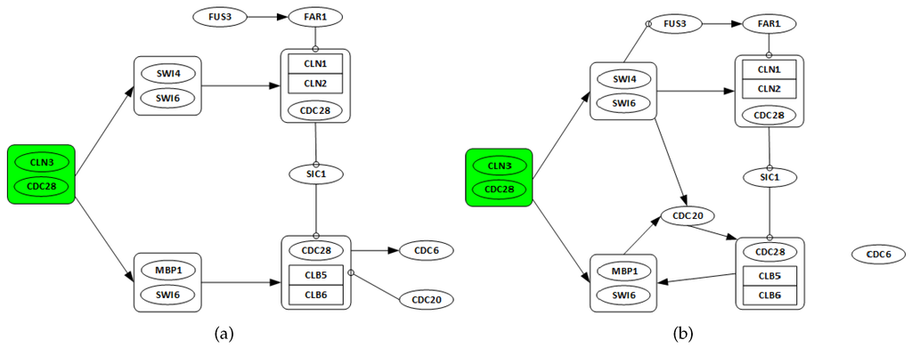 From 1998, when Spellman et al. published the yeast Saccharomyces cerevisiae (i.e., budding yeast) cell cycle microarray expression levels [38], many computational methods have been applied to these data. To demonstrate the applicability of the proposed algorithm in this study, a subset from yeast Saccharomyces cerevisiae microarray time series dataset including 14 genes, FUS3, SIC1, FAR1, CDC6, CDC20, CDC28, CLN1, CLN2, CLN3, CLB5, CLB6, SWI4, SWI6 and MBP1, is perturbed and used. The details of S. cerevisiae cell cycle control are well known, as shown in Figure 4a.