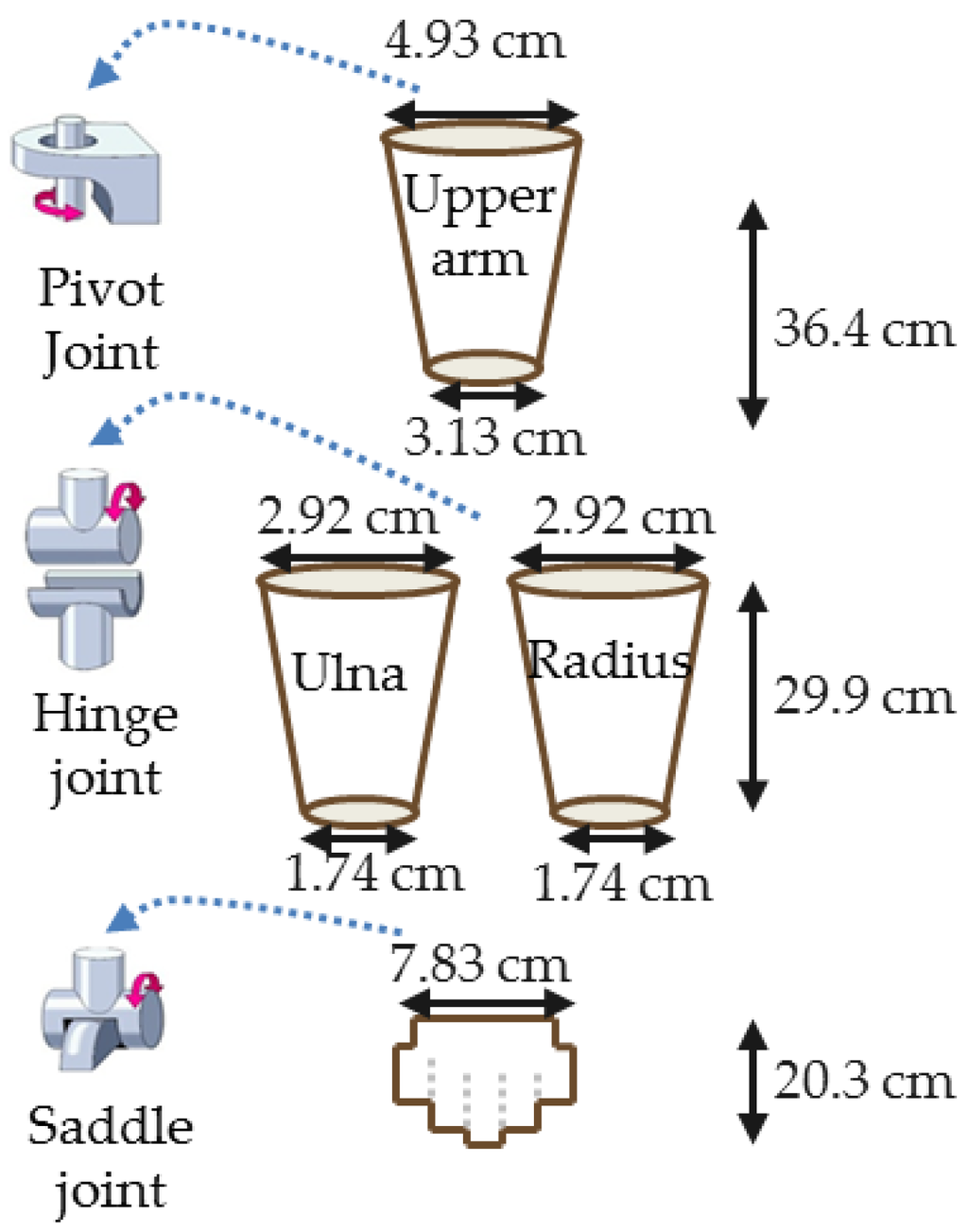 The human hand is modeled on the horizontal plane as three DOF rigid segments to describe the biodynamic behavior of the upper arm, forearm and the palm. The dimensions of the modeled hand segments and the used one DOF frictionless joints are shown in Figure 1. The upper arm is pinned to the fixed trunk by shoulder joint, the upper arm is hinged to the ulna and radius of the forearm by shoulder joint and the wrist joint connecting the forearm to the palm is modeled as a saddle joint. The right hand parameters are based on the experimentally determined values of length, mass, density and position of centroid demonstrated by Drillis et al. []. The mass of the upper arm, forearm and the palm are 2.070 kg, 1.160 kg and 0.540 kg [], respectively. These values with the designed geometry are used to calculate their mass moments of inertia: