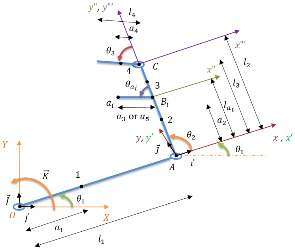 Motion will start at an instance of stability when with zero angular velocities. This assumption has no effect on the steady state response; it affects only the homogenous response which will disappear after 10 s (determined numerically using the fourth order Runge–Kutta iterative method). At this instance, the kinematics are determined using Coriolis theorem for the five DOF system (using dual DVA) described by five frames rotating with respect to the global coordinate system: