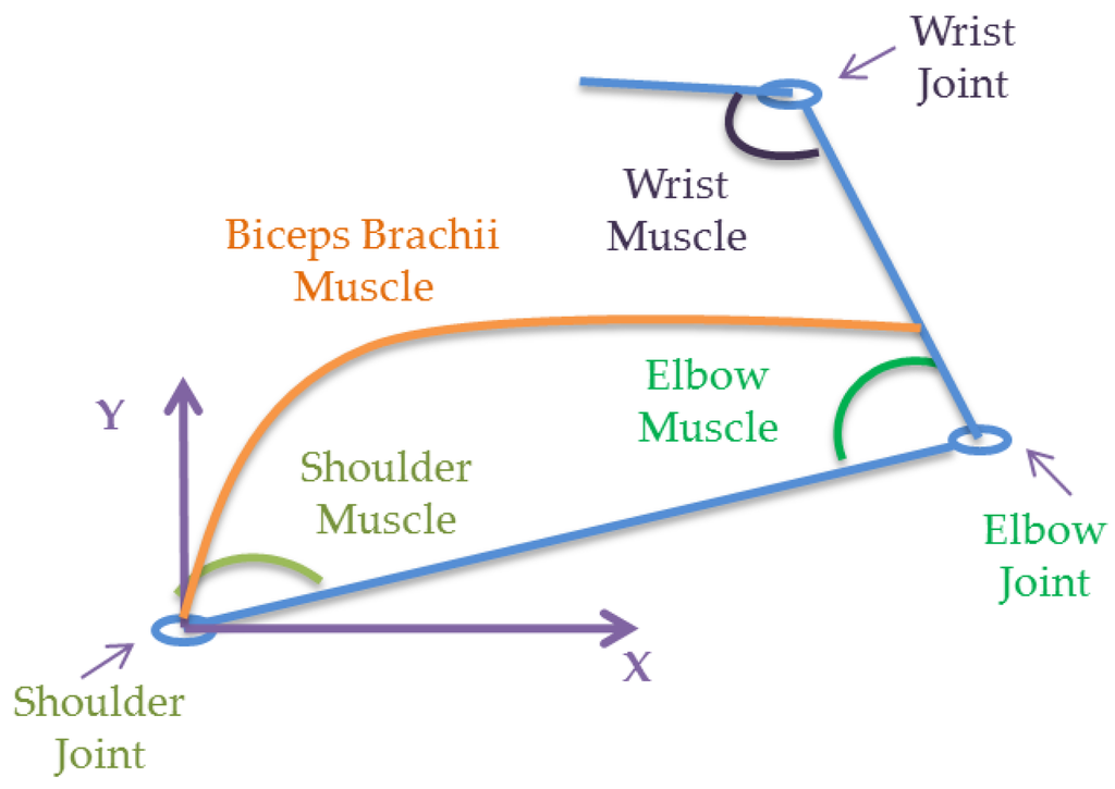 Four muscles are modeled as spring-damper systems in order to produce movement and are assumed to be regulated independently. The single joints shoulder, elbow and wrist joint muscles and the double joint biceps brachii muscle which pairs at the shoulder and elbow are shown in Figure 3. Their stiffness and damping coefficients are assumed to be proportional by a constant as shown in Table 1.