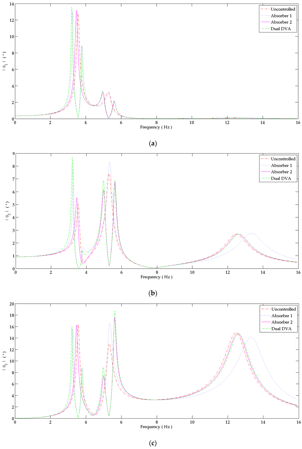 Substitute the calculated absorber’s parameters into (38) to obtain the mixed damping ratio of “absorber 1” and “absorber 2”, respectively, as 0.0015 and 0.0020. These damping ratios are within their accepted range. is the natural frequency of the primary system.