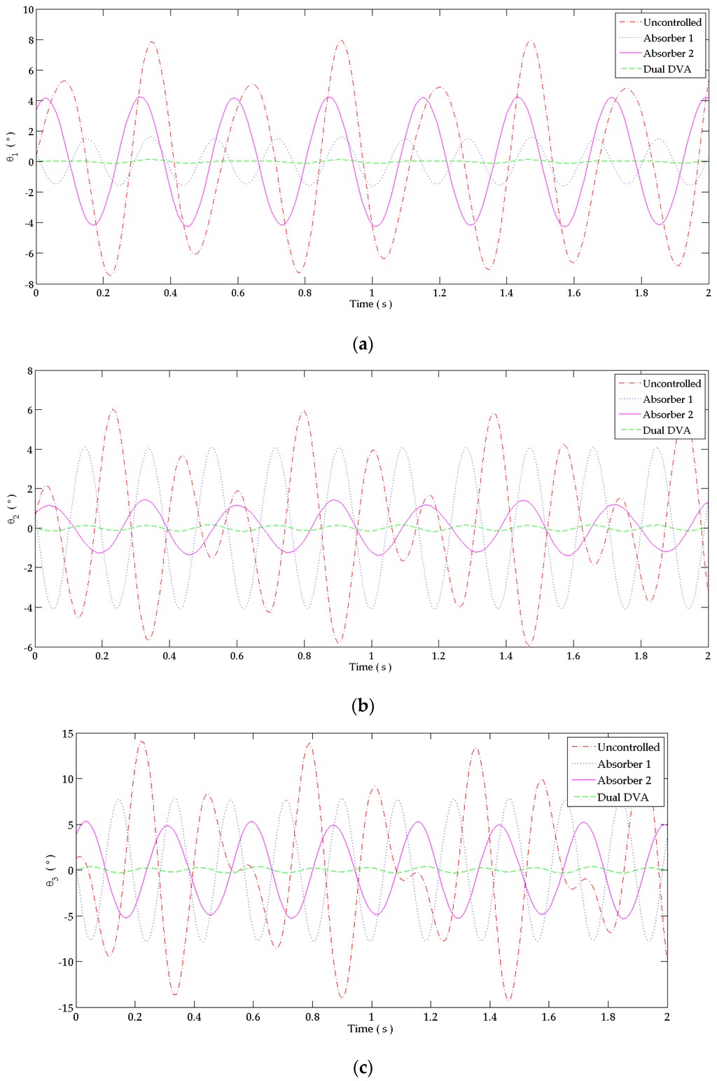 The human hand system is excited at the first and second resonance frequencies of the primary system reflecting the critical operating frequencies due to shoulder and elbow muscle activation. “Dual DVA” is used to satisfy the tuning conditions at both frequencies. The response of the uncontrolled and controlled systems is shown in Figure 8a–c. It is shown that all designed absorbers reduced the flexion motion at the joints. The ”dual DVA” was more efficient than “absorber 1” and “absorber 2” in suppressing involuntary tremor at the shoulder, elbow and wrist joints in the time domain.