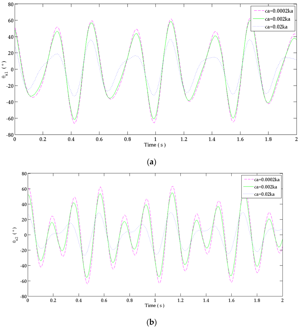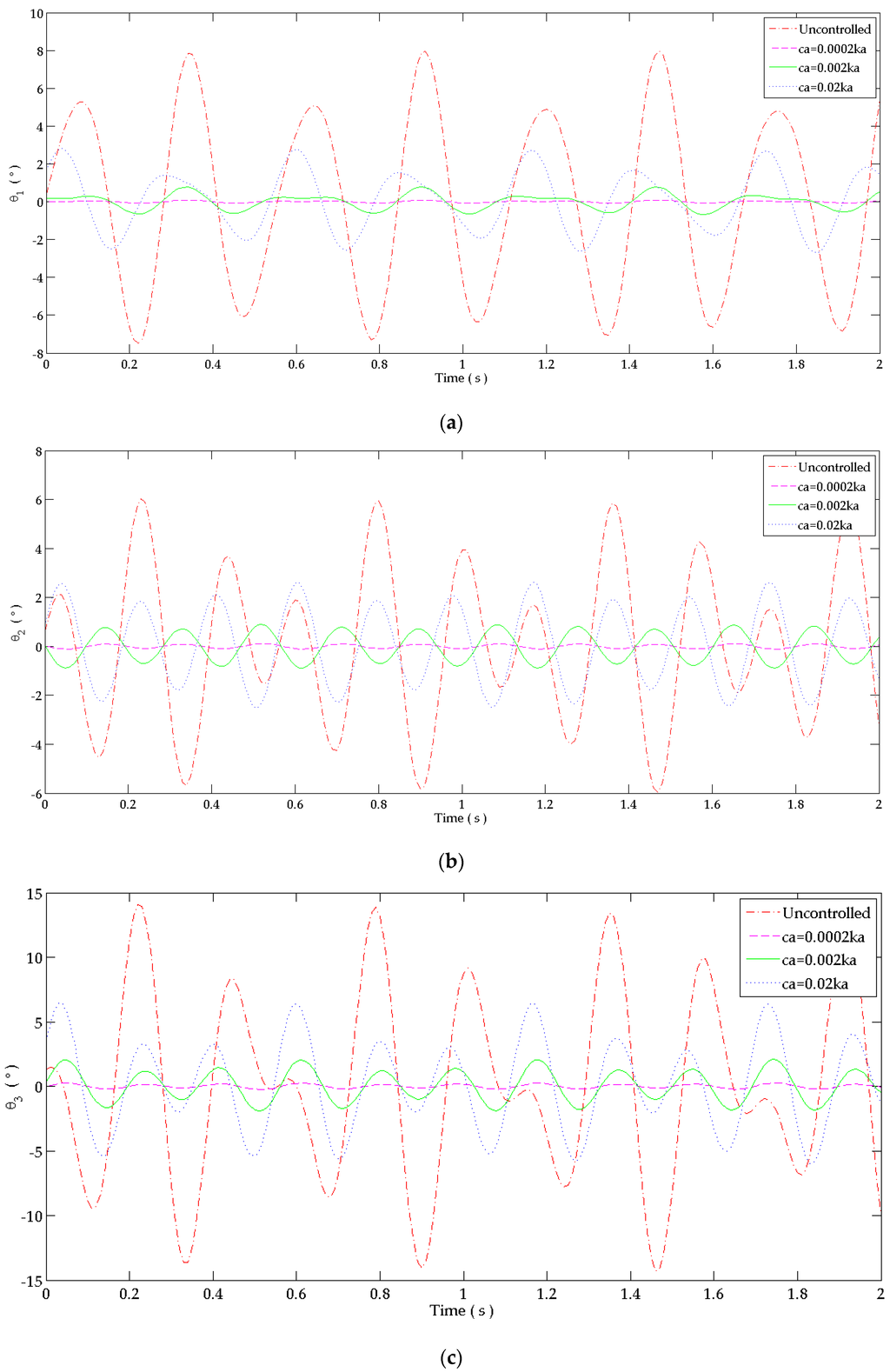 The effect of the damping coefficient of both steel beams absorbers is shown in Figure 9a–c for the ”dual DVA” in the time domain. It is shown that the maximum amplitude of the flexion angle at shoulder, elbow and wrist joints decreases as the damping coefficient value increases.