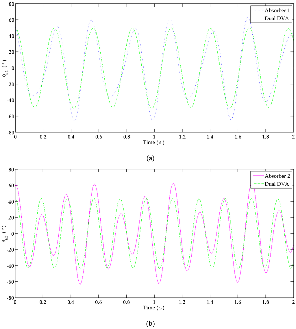 Response in time domain at: (a) “absorber 1”; (b) “absorber 2” joints. The fluctuations at the joints of the absorbers when attached alone and together as a ”dual DVA” for = 0.0002.
