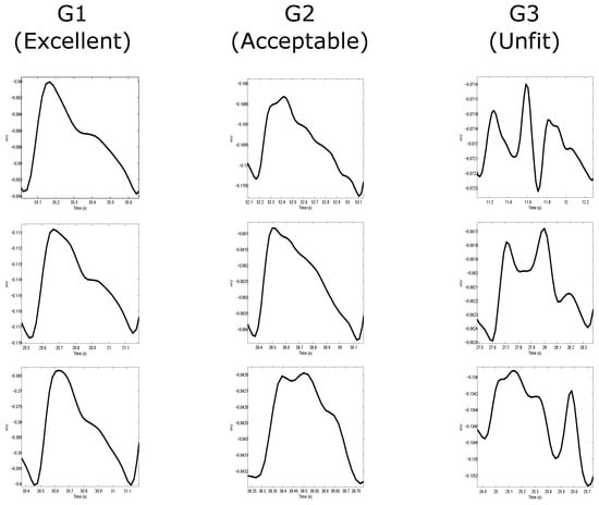 Two independent annotators annotated the signals (106 PPG recordings, 60 s each) based on three groups: Group 1 (G1) corresponds to “excellent” for diagnosis, Group 2 (G2) corresponds to “acceptable” for diagnosis, and Group 3 (G3) corresponds to “unfit” for diagnosis. The annotation process was carried out over each 60-s PPG recording. Each annotator annotated the PPG signal based on the most dominant beat morphology quality within the signal. Since it is expected that each 60-s recording will have approximately 60 beats, a 60-s recording with 30 beats or more will be considered dominant within its designated group. For consistency, these groups were clearly predefined (example shown in Figure 1) for the annotators that then adhered to the categories during the annotation process: