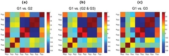 Correlation between the signal quality indices based on the adjudicated photoplethysmogram (PPG) signals. (a) excellent PPG signal quality (G1) versus acceptable PPG signal quality (G2); (b) G1 versus (G2 and unfit to diagnose PPG signals (G3)); and (c) G1 versus G3. Signal quality indices: perfusion (), kurtosis (), skewness (), relative power (), non-stationarity (), zero crossing (), entropy (), and the matching of systolic wave detectors (). Here, the red color and the blue color indicate strong correlation and anti-correlation, respectively.