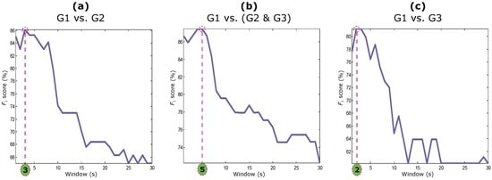 As can be seen in Figure 3, the performance of the deteriorated when the W increased. This is a new observation and has been reported before in the literature. The optimal W for the are s, s, and s for differentiating G1 from G2, G1 from (G2 & G3), and G1 from G3, respectively. It is logical that the needs a larger W to capture a unique signature when G2 and G3 are combined. However, a small W of 2 s was enough to distinguish an excellent PPG recording from an unfit one. In other words, the optimal SQI can be easily implemented on smart watches, mHealth apps, or/and wearable devices to detect PPG segments that are suitable for further analysis (such as heart rate calculation). For real-time analysis, a delay of one to two seconds is common. Despite the common delay, the is ideal since it exclusively captures high-quality PPG segments.