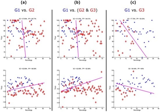 As we have three subsets of small sample sizes (e.g., , , and in the case of annotator 1), leave-one-out cross-validation for classifying G1 vs. G2, G1 vs. (G2 & G3), and G1 vs. G3 was used. Two statistical measures were used for the output of each classifier—sensitivity (SE), which was calculated using the formula , and positive predictivity (PP), which was calculated using the formula ; whereas TP is the number of true positives (G1 recordings detected as G1), FP is the number of false negatives ((G2 & G3)/G3 recordings detected as G1 recordings), and FN is the number of false positives (G1 recordings detected as (G2 & G3)/G3 recordings). To compare the performance of the SQIs given the imbalanced data in each classifier, the score is applied, as recommended in [], which is defined as .
