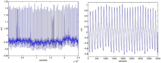 ECG and PPG signals were used for testing the algorithms, as shown in Figure 1. The ECG signal (sampling frequency of 360 Hz) was obtained from the MIT-BIH Arrhythmia Database [], while the PPG signal (sampling frequency of 367 Hz) was obtained from the Heat Stress PPG Database [].