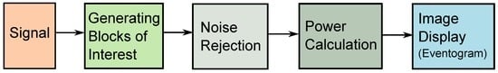 The eventogram is a novel visual-representation algorithm based on the fundamental concept of two moving averages. The idea of using two moving averages has already been tested over different biomedical signals for detecting a waves in APG (acceleration of PPG) signals [,,], for detecting c, d, and e waves in APG [], for detecting systolic waves in PPG signals [], for detecting QRS complexes in ECG signals [,], for detecting T waves in ECG signals [], and for detecting heart sounds []. An essential step of the two-moving-averages approach is the generation of the blocks of interest, and it is this step that is specifically applied in the eventogram methodology proposed in this paper. The blocks of interest are generated using two moving averages, which are now used to produce the eventogram. Noisy events rejection, power calculation, and image display are the new additional steps introduced to produce the eventogram. The structure of the eventogram is given in Figure 2.
