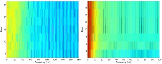 Spectrogram for ECG signal (left) and PPG signal (right) shown in Figure 1.