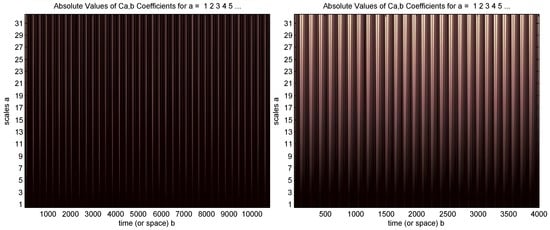 A continuous wavelet transform is used with the “sym2” wavelet and a 1–32 scale based on the recommendation in [], as shown in Figure 5. However, the wavelet visual presentation did not provide any information about the signal.