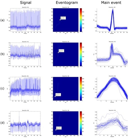 The eventogram analysis of biomedical signals with regular heart rhythm is simple and efficient as the heart beats are repeated with an equally spaced pattern. This regularity helps the time-domain threshold methodologies to detect main events successfully. The regular heart rhythm is called the normal sinus rhythm [], which means that the rhythm is constant and the occurrence of the next beat is predictable. The eventogram easily detects the QRS complexes and systolic peaks correctly in a regular heart rhythm in ECG and PPG signals, respectively, as shown in Figure 8a and Figure 9a. Moreover, the eventogram is able to detect main events in biomedical signals with irregular rhythm, as shown in Figure 8b,c and Figure 9c. The results show that the eventogram is suitable for any quasi-periodic biomedical signals, as it is robust against the irregular rhythm, non-stationary effects (cf. Figure 8b–d and Figure 9b–d), and low signal-to-noise ratio (cf. Figure 8d and Figure 9d).