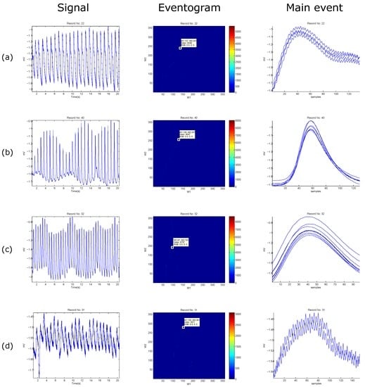 The eventogram describes the biomedical signal in terms of two time-domain window sizes and . The eventogram is a time–time representation which is different from the time-frequency representation produced by the spectrogram and wavelet methods. The time–time representation of a biomedical signal in terms of two windows will help clinicians understand the dominant durations and visualize their morphologies. Thus, the eventogram is more informative than the classical visualization methods. Note, the Recurrence Plot [] was not included in this study, as it represents phase space trajectory of the processed signal. The phase analysis is not meaningful for physicians or biomedical engineers when analyzing and diagnosing biomedical signals—correlating phase changes with a disease is not easy nor precise.