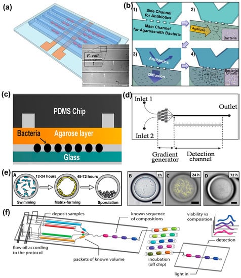 - Hou, Z.; An, Y.; Hjort, K.; Hjort, K.; Sandegren, L.; Wu, Z. Time lapse investigation of antibiotic susceptibility using a microfluidic linear gradient 3D culture device. Lab Chip 2014, 14, 3409–3418. [Google Scholar] [CrossRef] [PubMed]