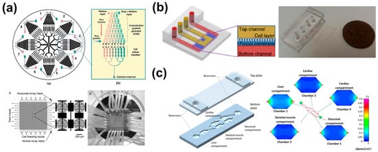 The next step toward the realization of a more systemic microfluidic system is to connect two or more (up to 14 []) organ-on-a-chip devices together to create a so-called “body-on-a-chip” or “human-on-a-chip”. These systems aim to reproduce in vivo pharmacokinetic, pharmacodynamic and ADME (absorption, distribution, metabolism, and excretion) profiles, or to investigate toxicity involving multiple organs or inter-organ interactions. Although no toxicity studies have been reported for antibiotics, using the body-on-a-chip technology, numerous studies showing the possibility of using this technique for toxicity testing of other drugs have been reported. For example, Oleaga et al., introduced a four-organ system that mimics the human response to five different drugs for 14 days []. The system, shown in Figure 2c, is composed of a gravity driven flow system that perfuses culture medium through five interconnected chambers (two cardiac compartments, one liver compartment, one skeletal muscle compartment and one neuronal compartment). The electrical and mechanical responses of the system to the five drugs were in agreement with published toxicity results from both human and animal data.