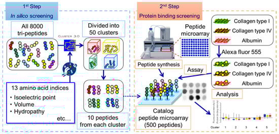 Despite these advantages, the largest disadvantage of the SPOT peptide microarray in terms of screening for ECM-selective peptides was the limited size of the library. Therefore, in this study, we introduced a clustering-assisted focused screening method, which has been demonstrated to enhance screening []. The essence of this screening concept is to minimize the risk of redundantly including highly similar peptides on the limited area of the custom array. In this method, by first clustering physicochemical properties of peptides in silico, physicochemically diverse types of peptides determined to be representative are synthesized on an array to screen for properties that satisfy the target function (Figure 1). We chose to screen trimer peptides for the discovery of Col IV-selective adhesion peptides for three reasons. First, it is our hope that these peptides will eventually be used in medical device coatings. For medical usage, peptides must be synthesized and purified at a commercial scale. As peptide length increases, synthesis efficiency can drop drastically and the purification process can suffer with hydrophobic sequences. Moreover, with present fermentation technology, tripeptides can be produced biologically at a lower cost and with less liquid waste. Second, trimer peptides are free from structural conformations. With peptides longer than 5-mers, there is the possibility of forming helices. If such conformations form on peptide microarrays, interpreting the assay results becomes extremely difficult. Lastly, we plan to combine the target Col IV-selective adhesion peptides with previously obtained cell-selective peptides to mimic ECMs. For this purpose, it was necessary to use the same trimer peptides as in our previous work.