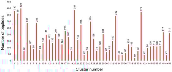 Number of peptides in each of the 50 clusters containing physicochemically similar peptides.