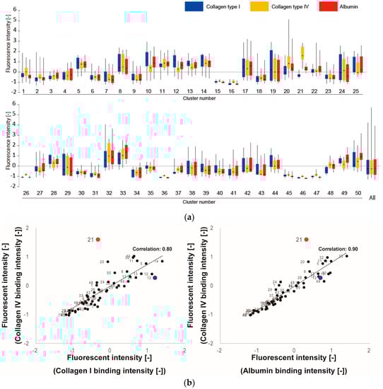 Results of screening for ECM-selective peptides. (a) The average fluorescence intensities of triplicate peptide spots are summarized for all clusters with box plots. The label “All” refers to the summarized value of all 500 tripeptides. For each cluster, the median value of the ten peptides is shown as a horizontal line, the 50% quantile area is shown as a box, and the standard deviation is shown as whiskers; (b) Correlation between Col IV and Col I or Alb in 50 clusters. Numeric character indicates cluster number. Red dots: cluster 21, blue dots: cluster 12; (c) Detailed plot of peptide binding rates in cluster 21 (Col IV-selective adhesion cluster). Each plot is representative of nine data points (triplicate spots from three different arrays). Fluorescence intensity values were normalized by standard normalization (average = 0, standard deviations = 1). * Denotes statistical significance compared to collagen I, p < 0.01, Student’s t-test. ** Denotes statistical significance compared to albumin, p < 0.01, Student’s t-test.