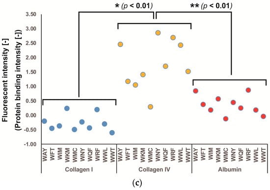 Human collagen type I (Col I; Santa Cruz Biotechnology, Dallas, TX, USA), human collagen type IV (Col IV; Collagen Research Center, Tokyo, Japan), and human serum albumin (Alb; MP Biomedicals, Newport Beach, CA, USA) were labeled with Alexa Fluor 555 succinimidyl ester (Invitrogen, Carlsbad, CA, USA). Peptide microarrays were hybridized with 20 ng/ml labeled protein for 2 h for each protein in turn. Peptide spots were scanned with a Typhoon FLA-7000 laser scanner (Fujifilm, Tokyo, Japan) at 532 nm/585 nm (excitation/emission) wavelengths. Recorded fluorescence intensities for all three proteins were analyzed with ArrayGauge Ver.2.1 (Fujifilm, Tokyo, Japan). Intensities were summarized, normalized, and analyzed by a previously reported method with slight modifications [].