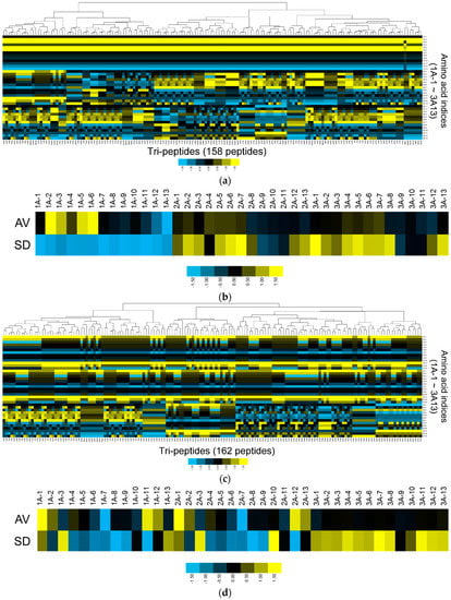 Figure 4b,d show the averages and standard deviations (SD) of the amino acid indices in each cluster at each position. At the N-terminal residue, cluster 21 exhibits a homogeneous pattern that differs considerably from that of cluster 12. Therefore, although the overall heat map reveals that there are still several smaller clusters of peptides included in cluster 21 (Figure 4a), the cluster’s overall propensity for Col IV-selectivity may be represented by the N-terminal residue.