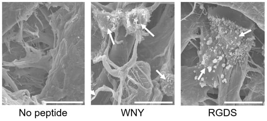 Scanning electron micrograph images of endothelial cells (ECs) on a Col IV-selective adhesion peptide (WNY)-coated and RGDS peptide-coated cellulose disk after 1 h of incubation. Adhered cells remaining after the washing procedure are indicated with white arrows. Scale bar, 15 μm.