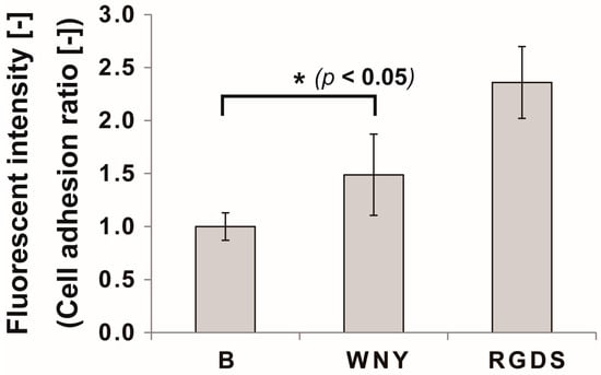 Results of the cell adhesion assay with cellulose disks coated in Col IV-selective adhesion peptide (WNY) or RGDS peptide. Cell numbers were measured by CalceinAM staining of live cells after 1 h of incubation. B: blank disk with no peptide coating. All experiments were performed six times (* p < 0.05, Student’s t-test).