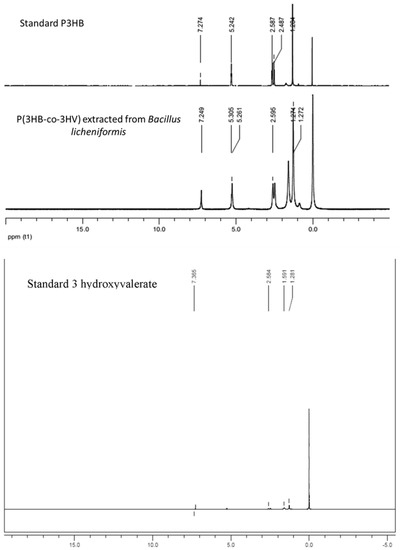 Nuclear magnetic resonance (NMR) spectra of purified product along with standard PHB and standard 3 hydroxy valerate.