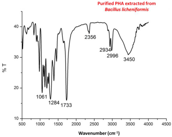 Fourier transform infrared spectroscopy (FTIR) spectra of purified PHA recovered from Bacillus licheniformis.
