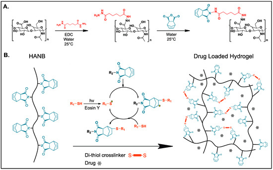 (A) Norbornene functionalized hyaluronic acid (HANB) two-step synthesis pathway; (B) Bioink photopolymerization for drug loaded hydrogel formation through thiol-ene reaction.