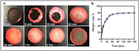 Hydrogel water content removal. (A) Hydrogels exposed to 50 °C for varying times; (B) Percent of weight loss in the hydrogel due to water removal with increasing drying times.