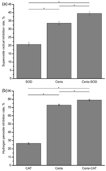 The results of the SOD enzymatic assay (a) and Amplex® Red assay (b) performed for SOD-ceria and CAT-ceria conjugates, non-functionalized ceria, catalase and superoxide dismutase. Based on the obtained calibration curves, the percentage of superoxide radicals (a) and hydrogen peroxide (b) inhibition results were calculated and are presented herein. Asterisks represent significant difference between values (p < 0.05, n = 4).