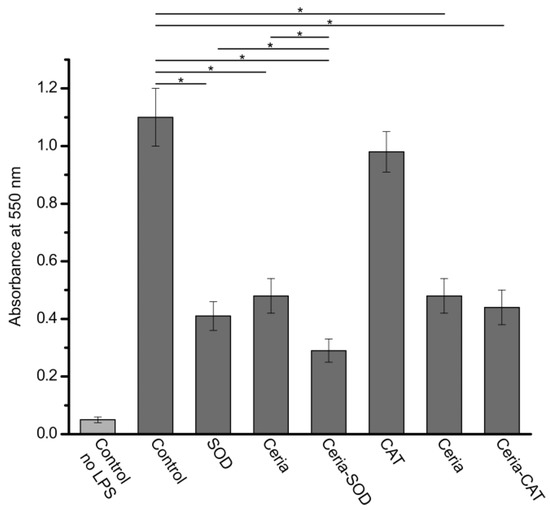 The results of the Griess test conducted for SOD- and CAT-ceria conjugates, and non-functionalized ceria, superoxide dismutase and catalase. The measured absorbance at 550 nm is directly correlated with the content of in the cell culture media. Asterisks represent significant difference between values (p < 0.05, n = 4).
