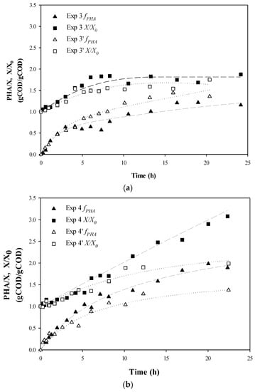 The experiments were designed to follow the time evolution of PHA storage and active biomass growth during the third stage of the PHA-production system and representative Experiment sets 3 and 4 are shown in Figure 2 (sets 1 and 2 can be seen in the Supplementary Materials). The extent of production of active biomass was variable between the experiments, but higher maximum specific growth rates were achieved for accumulations where acetic acid was fed (Experiment set 1 with 100% HAc, Experiment set 3 with 50%/50% HAc/HPr, and Experiment set 4 with alternating substrates) (Table 2). However, active biomass growth rates attenuated sooner for those accumulations where acetic acid was present at all times (Experiment set 1 and Experiment set 3), while the highest biomass production (X/X0) was achieved in Exp 4 (Figure 2, Table 2). With regard to PHA fraction evolution, a similar PHA content at plateau was achieved for all experiments. However, PHA content and yield tended to be higher in those accumulations with alternating substrates (Experiment set 4), with one experiment (Exp 4) maintaining an increasing PHA fraction even after 22 h of accumulation. This observation fits with the interpretations from other works that it is possible to stimulate PHA storage with concurrent cellular growth by supplying an optimal nutrient ratio [,,].