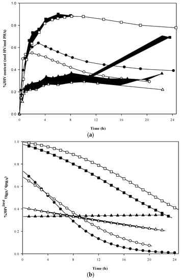 where t is time; HAc and HPr are the moles of acetic and propionic acids in solution; 3HB and 3HV are the moles of 3HB and 3HV, respectively; and is the specific consumption rate of substrate (S). The instantaneous relative rate change in 3HV monomers () was calculated relative to the total PHA specific production rate on a mole basis.