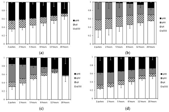 Carbon flux distribution (qPHB, qPHV, qX, qCO2) normalised respect to substrate uptake rate: (a) Experiment set 1: 100% acetic acid; (b) Experiment set 2: 100% propionic acid; (c) Experiment set 3: 50% acetic acid and 50% propionic acid fed simultaneously; and (d) Experiment set 4: 100% acetic acid alternating with 100% propionic acid.