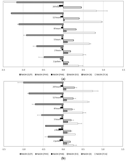 NADH generated and consumed at different stages of culture obtained by metabolic flux analysis (MFA): (a) Experiment set 3: 50% acetic acid and 50% propionic acid fed simultaneously; and (b) Experiment set 4: 100% acetic acid alternating with 100% propionic acid. (NADH was considered as internal metabolite).