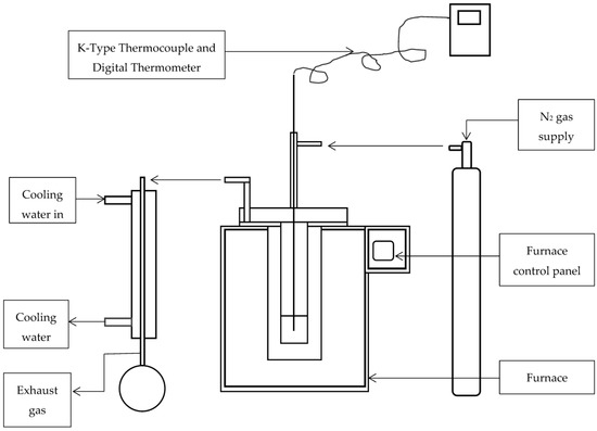Torrefaction of SCB was conducted in a laboratory scale batch torrefaction muffle furnace connected to a system that supplies N2 gas. A maximum of 0.5 kg of sample can be torrefied at a given time using this furnace. The furnace is ca. 42 cm in diameter, about 66 cm in height and 49 cm in length. Its combustion chamber is around 26 cm in diameter and 20 cm in height and length. The experimental setup consisted of a tube-type vessel made of stainless steel that is designed to fit inside of the furnace, a sample holder that also fits inside of the tubular vessel as well as a condenser for the collection of released gases. The maximum working temperature of the furnace is about 3000 °C. With the sample inside the furnace, the experiment was performed at 300 °C for 1 h. A simplified diagrammatic representation of the furnace used for torrefaction is presented in Figure 1.