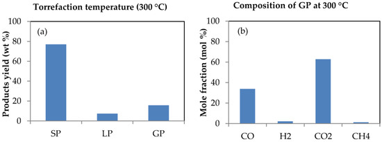Products obtained from bagasse torrefaction: (a) Product yield with SP, LP and GP representing the solid, liquid and gaseous products, respectively; (b) composition of gaseous products formed from sugarcane bagasse torrefaction at 300 °C, and at 5 min time of residence.