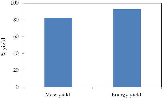 The yield of solids after torrefaction of biomass is a measure of the biomass resistance to thermal decomposition, which is defined according to Equation (1) [47]. The torrefied sample was weighed and a value of 12.3 g obtained.