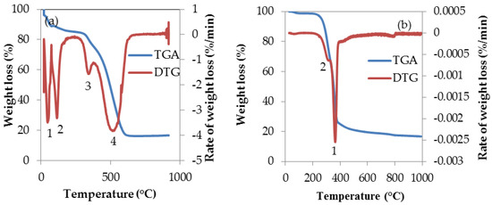 The three major constituents of biomass are cellulose, hemicellulose and lignin. Due to the structural differences of these constituents, they are commonly distinguished and identified by the use of TGA and the temperature ranges for the decomposition of these constituents had been measured in previous studies by other researchers [93,94]. The decomposition of hemicellulose occurs at 220–315 °C, and cellulose at 315–400 °C, while lignin decomposes over a wide temperature range beginning from 160–900 °C [95].